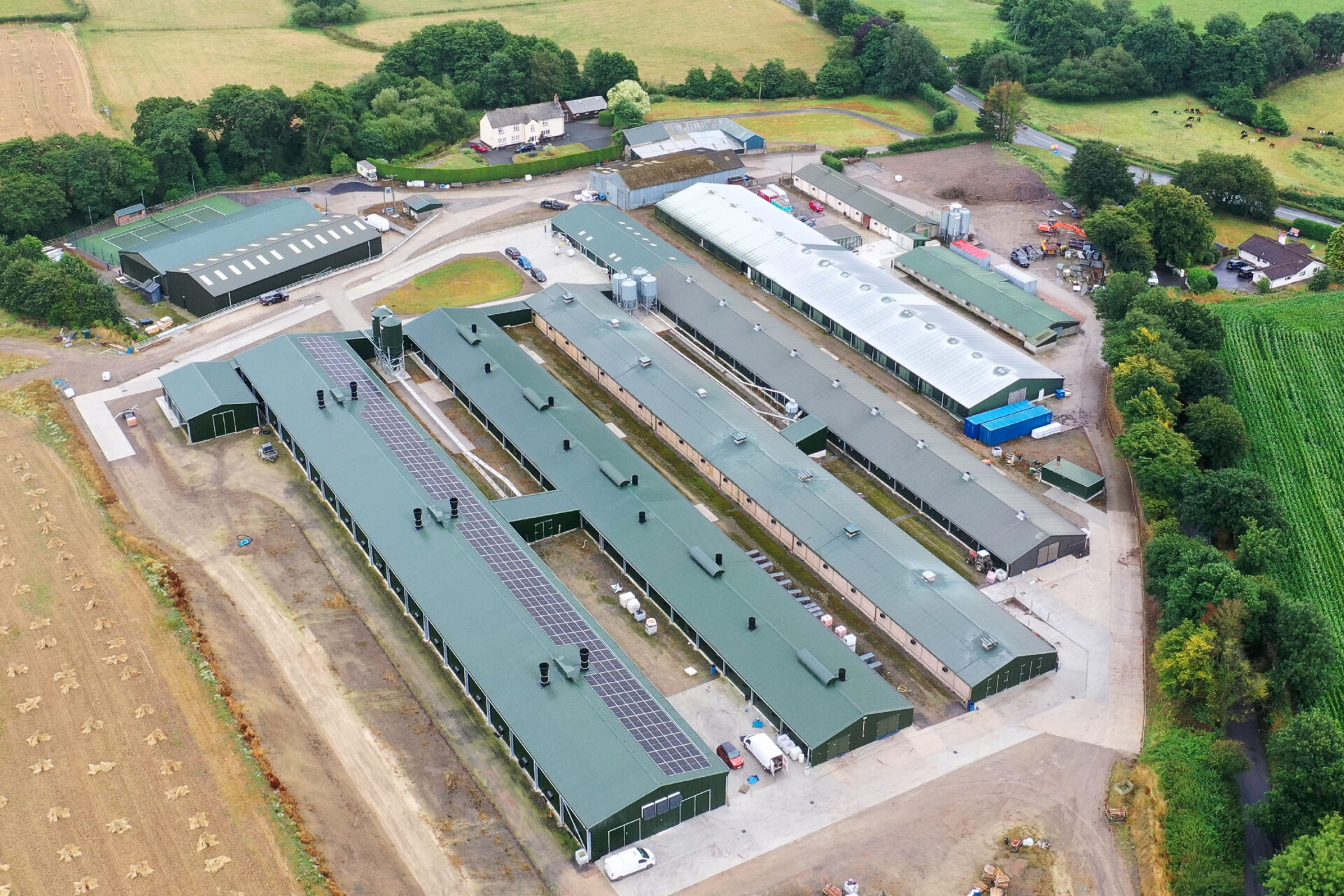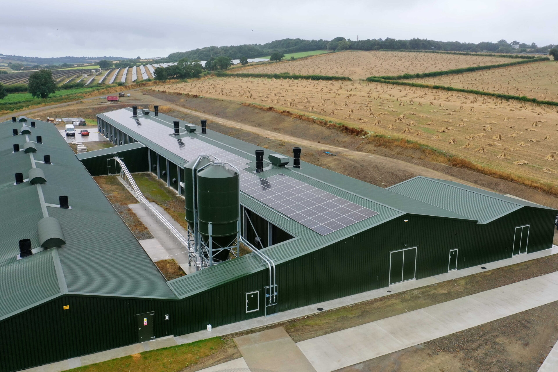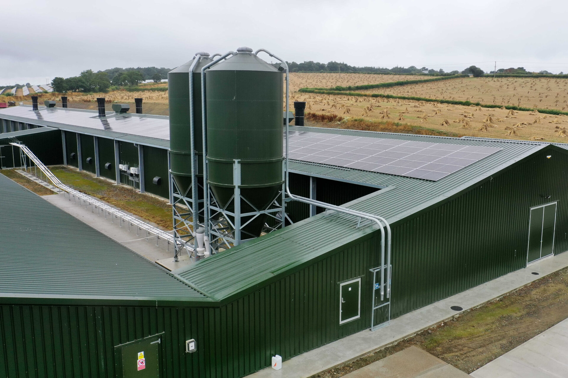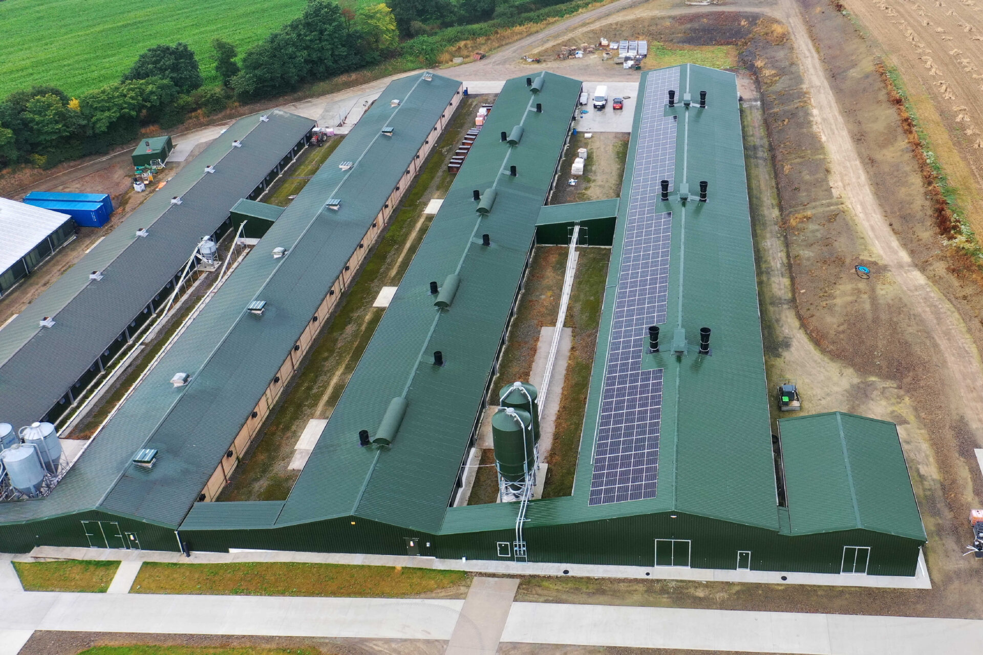 The aim was to build the most modern poultry building for 11,000 hens, while removing the two oldest breeder sheds (built in 1993 and 1996) from production and converting them into industrial spaces. The new shed was designed with future diversification in mind, featuring sufficient eaves height to accommodate a curtain lorry, which could park inside and be offloaded should poultry production ever become unviable at the site.
