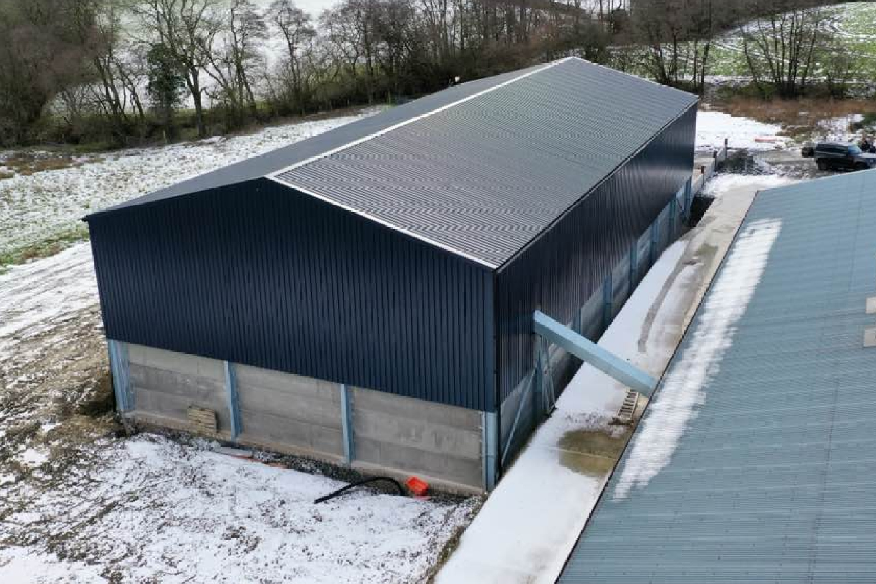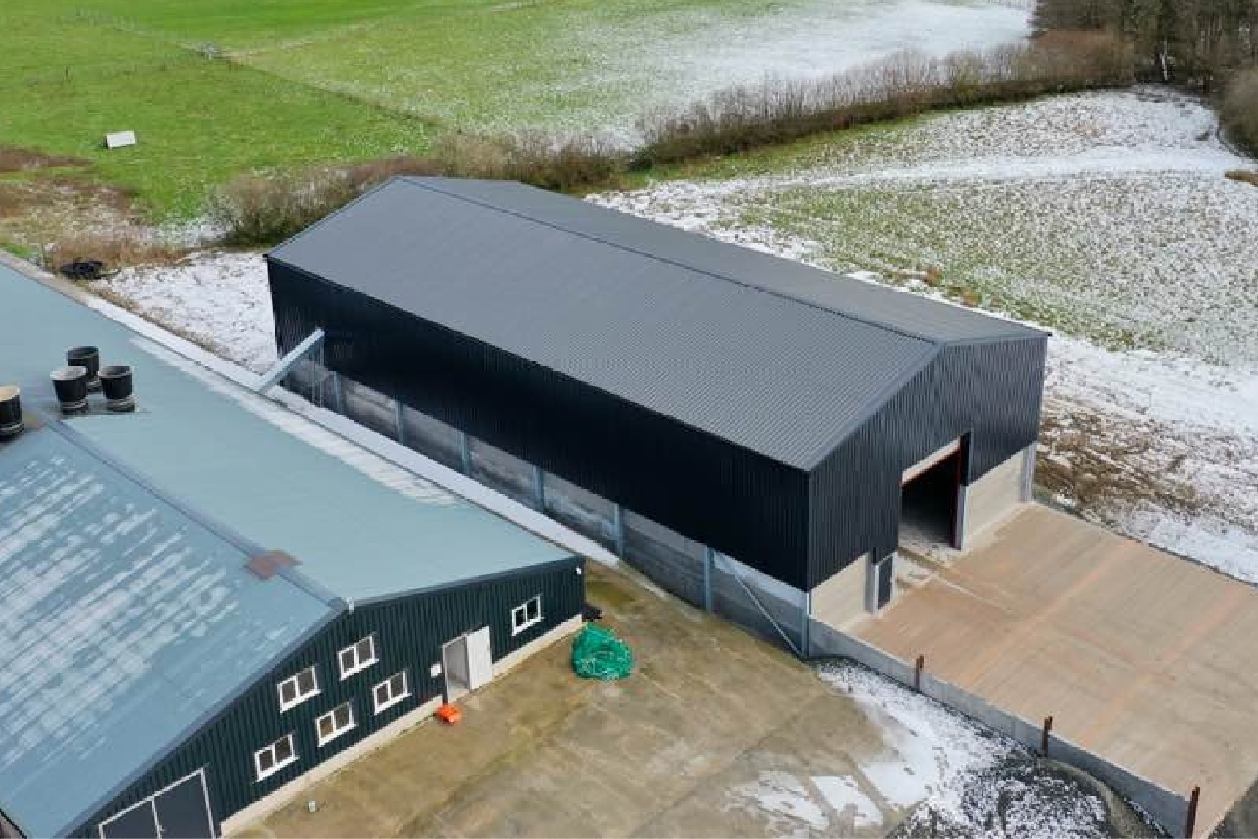 Working with the design and technical team, a number of ideas were presented to Joe for consideration.  Following site visits and discussions on the best solution, we designed a steel frame 50ft x 105ft by 25ft manure store, which was erected in Summer 2026.  The store features an access point from one side of the building for the manure conveyor belt to go straight into the adjacent free-range unit. Manure is conveyed directly from the one free range unit into the store, and moved by trailer from the second free range unit located nearby into the manure store.